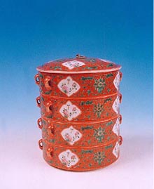 Porcelain four compartment box green and coral enamelled, with famille rose design